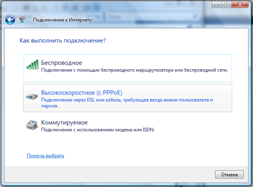 7. В появившемся окне выберете пункт Выскоскоростное (с PPPoE).