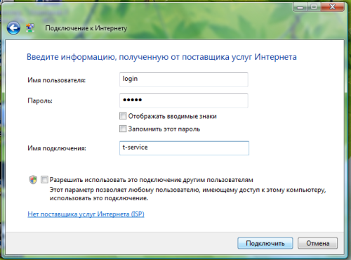 8. Введите "Логин" и "Пароль" указанные в Вашем договоре, а также укажите имя подключения, например, как показано на рисунке: